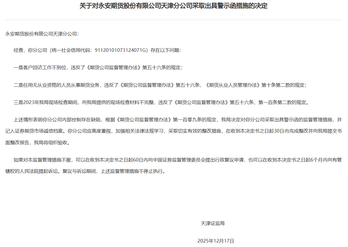 中国经济网北京12月24日电:中国证监会天津监管局网站近日发布公告,决定对永安期货股份有限公司天津分公司发出《关于公司治理及未来治理的建议》警示函;二、聘用不具备资格的人员从事期货业务,违反《期货公司监督管理办法》第五十六条、《期货从业人员管理办法》第十条第二款的规定;三、2023年天津证监局现场检查时,向天津证监局提供的现场检查材料不齐全,违反了《投资公司监督管理方案》第五十六条、第一百条第二款的规定。上述情况表明,存在以下情况:永安期货有限公司天津分公司内部控制存在缺陷。根据《期货公司监督管理方案》第一百零九条的规定,天津证监局决定采取监督管理措施,对永安期货有限公司天津分公司出具警告信,并记入证券期货市场诚信档案。永安期货于2021年12月23日在上海证券交易所主板挂牌上市,保荐机构为中信证券股份有限公司、保荐人周伟。吴云健、熊文峰 永安期货将于2021年12月30日(上市后第六个交易日)触及上市以来最高价41.69元。随后,股价震荡下跌。目前股价正处于突破点。永安期货首次公开发行股票募集资金总额为26.16亿元。之后扣除发行费用,募集资金净额为25.07亿元。永安期货2021年11月16日披露的招股书显示,公司计划募集资金25.07亿元,全部用于增加公司资本。永安期货首次公开发行股票总发行成本(不含增值税)1.08亿元,其中保荐承销费8679.25万元。以下为原文: